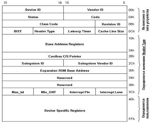 В заголовке содержится информация о производителе и типе устройства - поле Class Code (сетевой адаптер, контроллер диска, мультимедиа и т.д.) и прочая служебная информация.