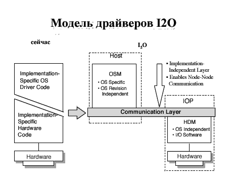 Спецификация I2O определяет разбиение драйвера устройства на две части: ОС-зависимого и аппаратно-зависимого модуля, созданного для конкретного устройства. Эти модули работают автономно и могут выполнять задачи независимо. В настоящее время поддержка I2O обеспечивается в NetWare 4, Windows NT Server 5.0 и UnixWare. Таким образом, технология с разбиением драйвера, уменьшает общее число требуемых драйверов: производители операционных систем пишут по одному драйверу на каждый класс устройств, например дисковые контроллеры, а производители оборудования - по одному драйверу на каждое свое устройство, который может быть использован с любой операционной системой поддерживающий I2O.