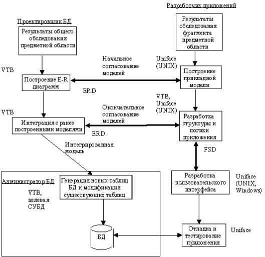 Конфигурация Vantage Team Builder for Uniface обеспечивает совместное использование двух систем в рамках единой технологической среды проектирования, при этом схемы БД (SQL-модели) переносятся в репозиторий Uniface, и, наоборот, прикладные модели, сформированные средствами Uniface, могут быть перенесены в репозиторий Vantage Team Builder. Возможные рассогласования между репозиториями двух систем устраняются с помощью специальной утилиты. Разработка экранных форм в среде Uniface выполняется на базе диаграмм последовательностей форм (FSD) после импорта SQL-модели. Технология разработки ИС на базе данной конфигурации показана на рисунке 3.1.