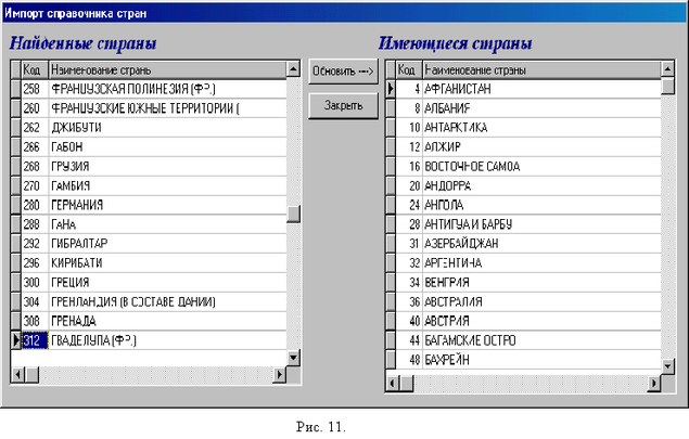 Автоматическое пополнение производится из базы данных АРМа текущего структурного подразделения или файлов переданных по электронной почте, на магнитном носителе. На рисунке 11 приведен пример пополнения справочника регионов России. Данный справочник разработан и применяется ГНИ РФ и является единым для всех предприятий.
