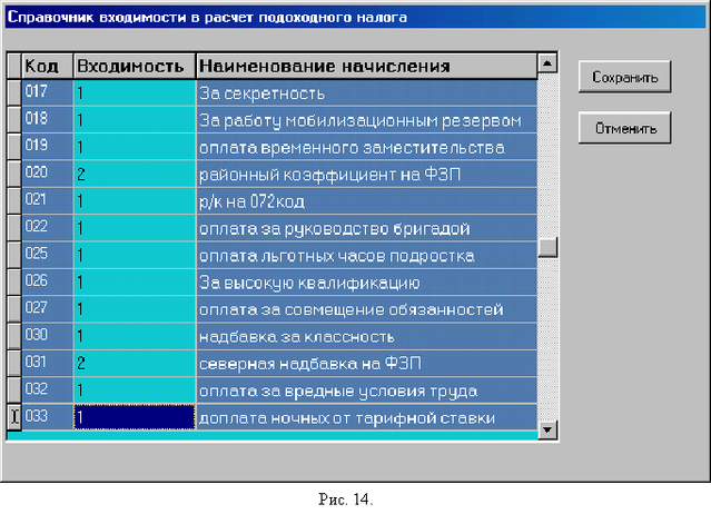 Проверка осуществляется на основании таблицы входимости начислений в расчет подоходного налога (пример заполнения см. на рисунке 14), таблицы шкалы налога, таблицы c суммами минимальных окладов, таблицы с коэффициентами льгот данных о начислениях/удержаниях, произведенных по физическим лицам.