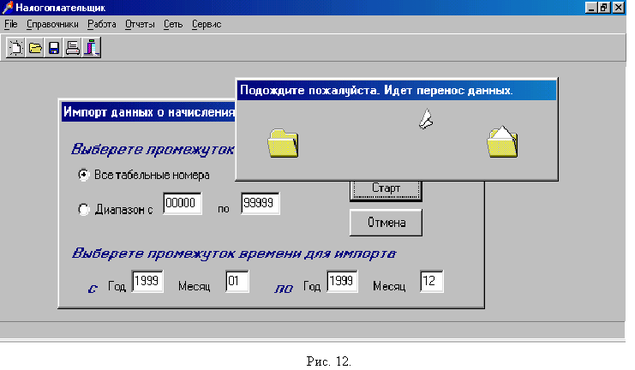 Пополнение информации о произведенных начислениях и удержаниях производится после предварительной выдачи запроса об интервале дат и табельных номеров. Фрагмент его мы можем наблюдать на рисунке 12. После чего выводится индикатор, отражающий текущее состояние процесса, выполняемую операцию (Рисунок 12).