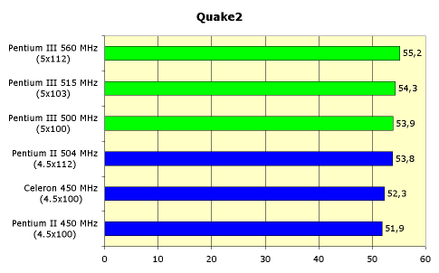 По этому тесту, хоть он и не использует новых SIMD-инструкций, Pentium III работает чуть быстрее Pentium II. Видимо, это происходит как раз благодаря усовершенствованному поточному доступу к памяти.
