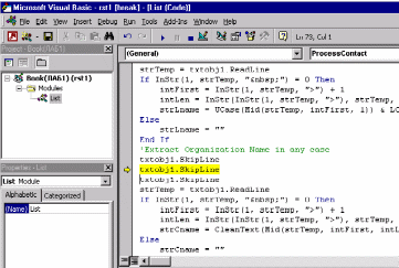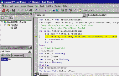 Цикл Do Until … Loop выполняется до тех пор пока не будет найдена строка, которая находится прямо перед строкой “X_FirstName”. Для этого используется ещё один цикл If …Then … Else … End If, который проверяет является ли читаемая строка txtobj1.ReadLine файла Myformrstl.htm строкой “ X_FirstName ”. Это осуществляется при помощи функции InStr , которая возвращает позицию искомой строки “X_FirstName”. И если она является таковой, то выполняется вторая процедура ProcessContact нашего проекта, если же нет – то продолжается цикл Do ... Loop.