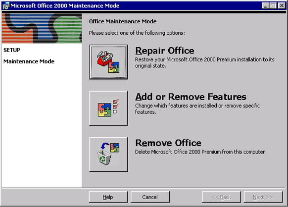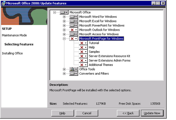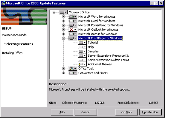 Для выполнения этого проекта необходимо было установить приложение MSFrontPage, который находится в пакете MSOffice2000. Его установочный пакет находится на компьютере User7 нашей локальной сети. При запуске установочного файла мы выбираем “add or remove Features”(См. Рис.1)