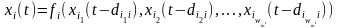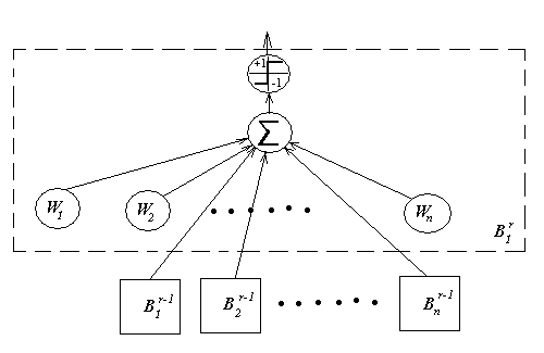 По сути схема является совокупностью композиций некоторых параметризованных операций. Глубина схемы есть максимальный уровень вложенности композиций. В методологии НС важно, что эти операции являются вычислительно простыми, наподобие взвешенной суммы или булевых конъюнкции и дизъюнкции, при этом выбирается большое количество аргументов и композиций. В этом суть коннективизма. Параметр t является по сути временным параметром. Заметим, что здесь и далее полагаем время дискретным, хотя для формализации НС это не принципиально. Перенумеровав вершины схемы, можно записать общий вид параметризованной операции: