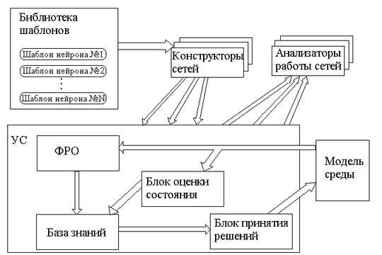 На приведенной схеме (рис 5.1) указаны основные классы объектов ядра системы и их взаимодействие. Стрелками показаны потоки данных при работе системы. Каждому из основных блоков УС соответствует свой блок в системе. Четыре блока: ФРО, БЗ, БОС и БПР составляют УС. Напомним, что в подразделе “Формализация НС” раздела 1 мы определили такие понятия как блок, выходная функция блока, шаблон, нейронная сеть и формальная модель нейрона. Из формальной модели НС следует, что блок – это иерархическая структура, в которой элементы одного уровня соединены в сеть и каждый из элементов уровня может быть сетью, состоящей из элементов более низкого уровня. Рассматривая выбранный элемент какого-нибудь уровня, можно считать его “черным ящиком”, т.е. абстрагироваться от его содержимого и внутреннего устройства. Например, можно на некотором промежуточном этапе конструирования УС абстрагироваться от нейро-сетевой реализации какого-либо блока верхнего уровня и попробовать различные реализации, причем необязательно нейросетевые. Система не накладывает ограничений на внутреннее устройство каждого блока, поэтому оно может не иметь внутренней иерархии, а просто представляться некоторой функцией выхода. Далее, в процессе развития УС, содержимое отдельных блоков может поменяться, возможно стать более сложным и иерархическим, при этом поведение системы не изменится, если новое содержимое обеспечивает функциональность старого в смысле эквивалентности выходных функций. Таким образом, облегчается разработка системы, т.к. появляется возможность конструирования “сверху вниз”, нет необходимости реализовывать блок сразу через НС, можно поставить временную “заглушку”, а в процессе развития системы усложнять, дополнять или заменять на совершенно иную внутреннюю конструкцию блоков.