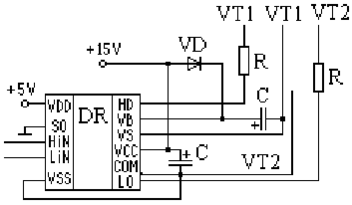 Транзисторный модуль М2ТКИ-50-12 управляется специализированным драйвером - драйвер транзисторных модулей такого типа - IR2112 фирмы International Rectifier. Драйвер способен выдерживать напряжения до 600 вольт. Схема включения приведена ниже: