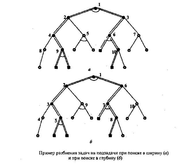 Для графа И/ИЛИ, так же как для поиска в пространстве состояний, можно определить поиск в глубину и поиск в ширину как в прямом, так и в обратном направлении. На рис. 3.4. приведен пример поиска в ширину (рис. 3.4., а) и поиска в глубину (рис. 3.4., б). На рисунке вершины пронумерованы в том порядке, в котором они раскрывались, конечные вершины обозначены квадратами, разрешимые вершины зачернены, дуги решающего графа выделены двойными линиями.