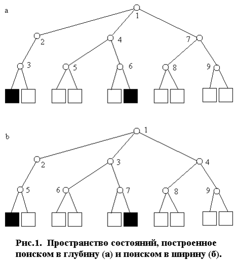 Целевые вершины помечены черными квадратами, а терминальные - белыми квадратами. При использовании каждого из способов могут быть найдены все решения. При переборе всего пространства оба метода будут анализировать одинаковое количество вершин, однако метод поиска в ширину будет требовать существенно больше памяти, так как он запоминает все пути поиска (а не один, как при поиске в глубину).