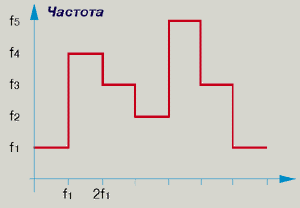 Одним из способов формирования широкополосного сигнала является метод частотных скачков (frequency hopping spread spectrum - FHSS). В упрощенном виде (рис. 7) его можно представить следующим образом: каждый из последующих бит информации "перескакивает" на другую несущую частоту (одну из 79, определенных стандартом 802.11 для FHSS). Порядок чередования поднесущих определяется псевдослучайной последовательностью. Ясно, что не зная ее, принять передачу невозможно. Каждая пара приемник-передатчик работает с одной и той же последовательностью. Очевидно, что если в непосредственной близости друг от друга работают несколько таких пар, использующих разные последовательности скачков частоты, то они друг другу не мешают. Если же в некоторый момент чьи-то несущие случайно совпадут и соответствующие данные будут испорчены, то эту ошибку можно выявить (например, с помощью протоколов более высоких уровней), и необходимый фрагмент (очень небольшой) будет передан еще раз. Точно таким же образом обеспечивается и помехозащищенность передачи по отношению к узкополосным помехам - если помехи случайно совпадут по частоте с одной из несущих, придется повторно передать очень небольшую часть общего объема данных. Отметим (сейчас станет ясно, почему это так важно), что по интенсивности радиосигнал, передаваемый по методу FHSS, не уступает узкополосному сигналу, и поэтому активно работающие ШПС-средства вполне могут служить источником помех для других устройств.