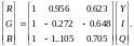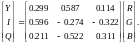 В канале Y яркость подобрана так, что она соответствует цветовой чувствительности глаза. Канал Y соответствует цветам от голубого до оранжевого (теплым тонам). Канал Q - от зеленого до пурпурного. В качестве опорного белого был взят источник с температурой 6500К. Преобразования между цветовыми системами RGB и YIQ: