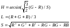 Пример перевода RGB в HSB. В данном формате RGB имеет на каждую из компонент R, G, B по 8 бит (256 уровней градации) - True Color. HSB представлен тремя плоскостями, соответствующими H, S, B, в виде черно/белых изображений с 256 уровнями градации серого.