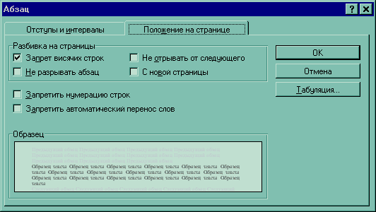 | Запрет висячих строк (Widow/Orphan Control)) | Предотвращает вывод одиночной последней строки абзаца в начале новой страницы или вывод первой строки абзаца в конце страницы |