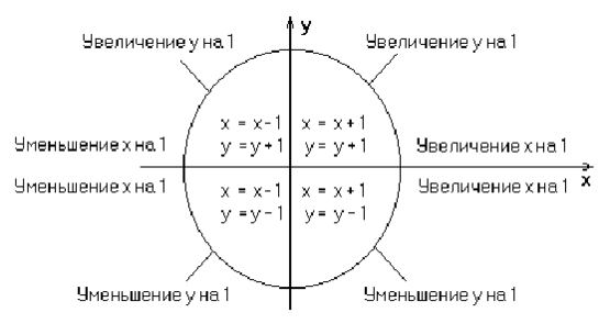Чтобы реализация алгоритма была полной необходимо обрабатывать отрезки во всех октантах. Когда абсолютная величина углового коэффициента больше 1, y постоянно изменяется на единицу, а критерий ошибки Брезенхема используется для принятия решения об изменении величены x. Выбор постоянно изменяющейся (на +1 или –1) координаты зависит от квадранта (рис. 2.2).