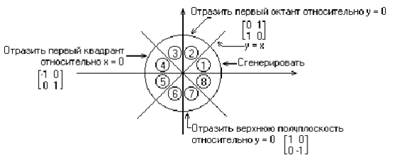 Брезенхему. Для начала заметим, что необходимо сгенерировать только одну восьмую часть окружности. Остальные её части могут быть получены последовательными отражениями, как это показано на рис. 2.3. Если сгенерирован первый октант (от 0 до 45 против часовой стрелки), то второй октант можно получить зеркальным отражением относительно прямой у = x, что дает в совокупности первый квадрант. Первый квадрант отражается относительно прямой x = 0 для получения соответствующей части окружности во втором квадранте. Верхняя полуокружность отражается относительно прямой у = 0 для завершения построения. На рис.2.3. приведены двумерные матрицы соответствующих преобразований.
