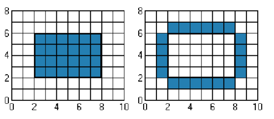 Если область относится к внутренне - определенным, то все пикселы, принадлежащие внутренней части, имеют один и тот же цвет или интенсивность, а все пикселы, внешние по отношению к области, имеют другой цвет. Это продемонстрировано на рис. 2.10. Если область относится к гранично-определенным, то все пикселы на границе области имеют выделенное значение или цвет, как это показано на рис. 2.11. Алгоритмы, заполняющие внутренне - определенные области, называются внутренне - заполняющими, а алгоритмы для гранично-определённых областей – гранично-заполняющими. Далее будут обсуждаться гранично-заполняющие алгоритмы, однако соответствующие внутренне заполняющие алгоритмы можно получить аналогичным образом.