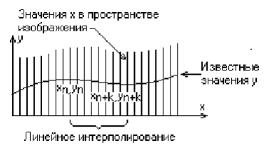 В изложенном алгоритме предполагается, что значение функции, т. е. y, известно для каждого значения x в пространстве изображения. Однако если для каждого значения x нельзя указать (вычислить) соответствующее ему значение у, то невозможно поддерживать массивы верхнего и нижнего плавающих горизонтов. В таком случае используется линейная интерполяция значений у между известными значениями для того, чтобы заполнить массивы верхнего и нижнего плавающих горизонтов, как показано на рис. 3.5.