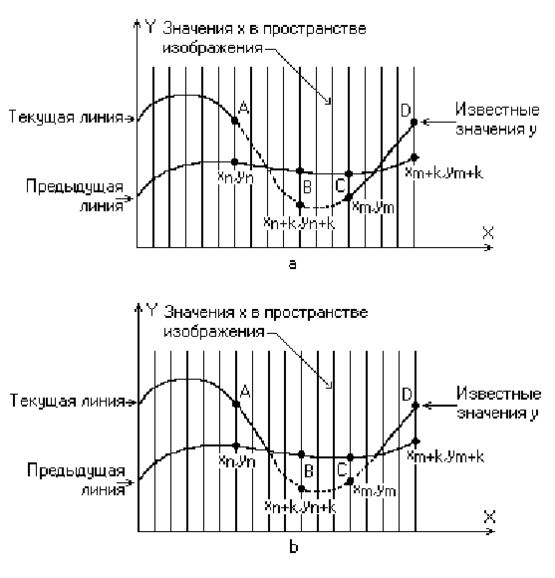 Если видимость кривой меняется, то метод с такой простой интерполяцией не даст корректного результата. Этот эффект проиллюстрирован рис. 3.6,а. Предполагая, что операция по заполнению массивов проводится после проверки видимости, получаем, что при переходе текущей кривой от видимого к невидимому состоянию (сегмент АВ на рис. 3.6,а), точка (xn+k, yn+k ) объявляется невидимой. Тогда участок кривой между точками (xn, yn) и (xn+k, yn+k ) не изображается и операция по заполнению массивов не производится. Образуется зазор между текущей и предыдущей кривыми Если на участке текущей кривой происходит переход от невидимого состояния к видимому (сегмент CD на рис. 3.6,а), то точка (xm+k, ym+k ) объявляется видимой, а участок кривой между точками (xm, ym) и (xm+k, ym+k ) изображается и операция по заполнению массивов проводится. Поэтому изображается и невидимый кусок сегмента CD. Кроме того, массивы плавающих горизонтов не будут содержать точных значений у. А это может повлечь за собой дополнительные нежелательные эффекты для последующих кривы. Следовательно,