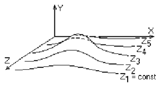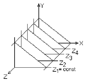 На рис. 3.2 приведен пример, где указанные параллельные плоскости определяются постоянными значениями z. Функция F ( x, у, z ) = 0 сводится к последовательности кривых, лежащих в каждой из этих параллельных плоскостей, например к последовательности
