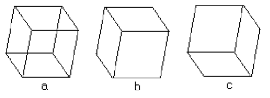 Необходимость удаления невидимых линий, ребер, поверхностей или объемов проиллюстрирована рис.3.1. На рис.3.1, а приведен типичный каркасный чертеж куба. Его можно интерпретировать двояко: как вид куба сверху, слева или снизу, справа. Удаление тех линий или поверхностей, которые невидимы с соответствующей точки зрения, позволяют избавиться от неоднозначности. Результаты показаны на рис.3.1, b и c.