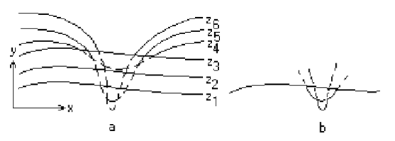 Алгоритм работает очень хорошо до тех пор, пока какая-нибудь очередная кривая не окажется ниже самой первой из кривых. Как показано на рис.3.4,а. Подобные кривые, естественно, видимы и представляют собой нижнюю сторону исходной поверхности. Однако алгоритм будет считать их невидимыми. Нижняя сторона поверхности делается видимой, если модифицировать этот алгоритм, включив в него нижний горизонт, который опускается вниз по ходу работы алгоритма. Это реализуется при помощи второго массива, длина которого равна числу различимых точек по оси x в пространстве изображения. Этот массив содержит наименьшие значения y для каждого значения x. Алгоритм теперь становится таким: