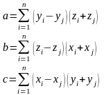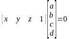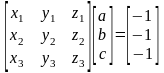 Хотя уравнение плоскости (3.1) содержит четыре неизвестных коэффициента, его можно нормировать так, чтобы d = 1 следовательно, трех неколлинеарных точек достаточно для определения этих коэффициентов. Подстановка координат трех неколлинеарных точек (x1, y1, z1), (x2, y2, z2), (x2, y2, z2) в нормированное уравнение (3.1) дает:
