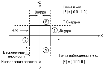 который служит, кроме того, образом точки, лежащей в бесконечности на отрицательной полуоси z. Фактически [Е] представляет любую точку, лежащую на плоскости z = , т. е. любую точку типа (x, y, ). Поэтому, если скалярное произведение [Е] на столбец, соответствующий какой-нибудь плоскости в матрице тела, отрицательно, то [Е] лежит по отрицательную сторону этой плоскости. Следовательно, эти плоскости невидимы из любой точки наблюдения, лежащей в плоскости z = , а пробная точка на z = экранируется самим телом, как показано на рис. 3.8. Такие плоскости называются не лицевыми, а соответствующие им грани задними. Следовательно,