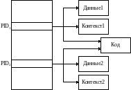 Тело процесса, - как уже было сказано, можно представить в виде объединения сегмента текста (кода) и сегмента данных. Развитые ОС позволяют размещать сегменты текста и данных в различных, не зависящих друг от друга, местах оперативной памяти. Это хорошо, так как вместо одного большого куска памяти нам требуется два маленьких. Но еще лучше следующее - такая организация позволяет использовать сегмент кода повторно. В системе допускается существование еще одного процесса с собственным контекстом, сегментом данных, но у которого общий с другими процессами сегмент кода.