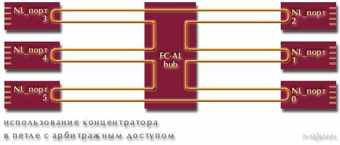 Классическая схема подключения до 126 портов, с которой все и начиналось, если судить по аббревиатуре FC-AL.