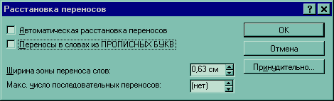 Командой Расстановка переносов (Hyphenation) в меню Сервис откройте окно диалога Расстановка переносов, изображенное на рисунке :