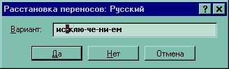 Каждый раз, когда Word обнаруживает слово, требующее переноса, он открывает окно диалога Расстановка переносов, в котором показывает это слово и предлагает возможное место разрыва.