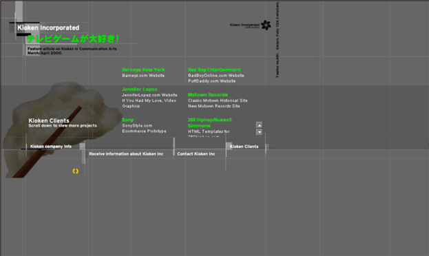 Сайт Японской дизайн студии Кioken Incorporated очень популярной в Америке. И является одной из самых дорогих студий. Её услугами пользуются крупные фирмы, Rep и Pop звёзды. Jennifer Lopez, Slim Shady, Sony, Universal Records, Canon USA и многие другие.