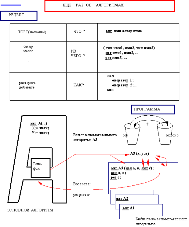Это показано на ЛОС 4. К моменту вызова (опорный сигнал в виде телефона) вспомогательного алгоритма с именем А3 в основном алгоритме должны быть обязательно описаны и определены значения переменных, которые при вызове будут переданы как аргументы. Также должна быть описана величина, которая будет передана во вспомогательный алгоритм для получения результата его работы.