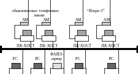 - 4 коммуникационных серверов(хостов), 2 из которых подключены к обычной коммутируемой телефонной линии и 2 к коммутируемой телефонной линии “Искра-2”;