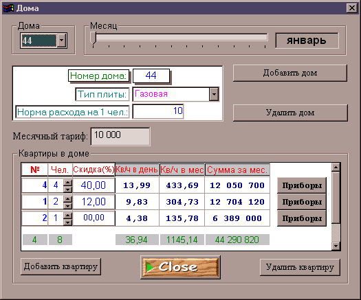 а) “Дома” – отчет по домам. Пользователь выбирает из списков в верхней части окна дом и месяц, по которым он желает получить отчет. Возможно также задание всех домов и (или)всех месяцев одновременно. В этом случае просмотр отчетных данных, которые в данный момент не отображаются, осуществляется с помощью полосы прокрутки.