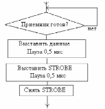 Для передачи информации используется параллельный порт ввода-вывода PPI (DD16) На нем также реализован интерфейс ИРПР-М. Данные выдаются через порт А. Сигнал STROBE поступает в линию связи через нулевой разряд порта В. Сигналы готовности приемника BUSY и ACKNLG поступают в порт С (разряды 1 и 0 соответственно). Так как импульс ACKNLG имеет длительность около 5 мкс, то его программная фиксация в режиме параллельной обработки нескольких задач затруднена. Предусмотрена аппаратная защелка этого сигнала с помощью триггера. После получения сигнала ACKNLG триггер программно сбрасывается. Аналогичная схема присутствует и в блоке приема данных.