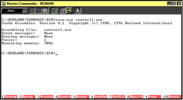 Фрагмент программы, представленный в приложении полностью соответствует описанной выше схеме алгоритма. Программа выполнена в виде самостоятельного модуля. Трансляция проводилась с помощью ассемблера TASM 5.0. Результаты работы транслятора показаны на рисунке 3.7.