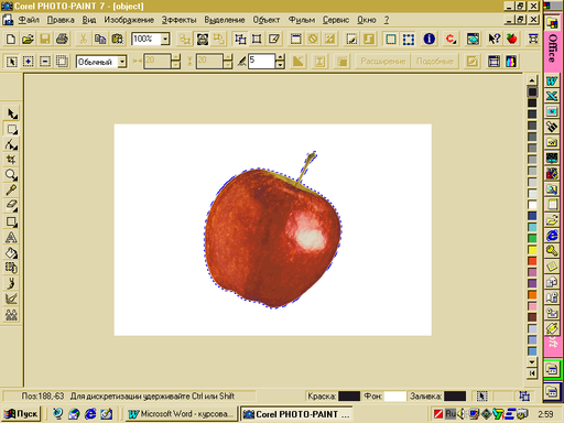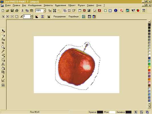10. Щелкните кнопку записи в файл (третья слева на стандартной панели инструментов) и сохраните изображение в файле с именем APPLE О В J в папке DRAWINGS. Отметьте, что по умолчанию к имени файла присоединяется расширение .CPT. Это означает, что изображение записано в формате Corel PHOTO-PAINT. Щелкните кнопку ОК. Теперь сохраненный вами объект превратился в самостоятельное изображение, считанное из файла APPLEOBJ.CPT.