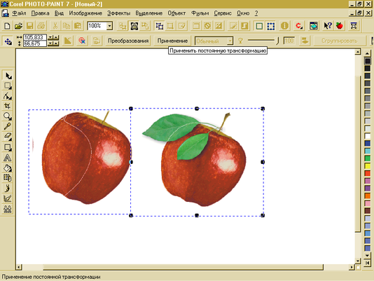 2. С помощью вертикальной линейки прокрутки разместите изображение яблока по вертикали в середине окна документа. Щелкните инструмент «Выбор». Переместите копию объекта, установив указатель мыши внутри области, ограниченной маркерами, и перетащив объект влево от исходного положения в пределах окна документа правой кнопкой мыши. Расположите объект таким образом, чтобы он не перекрывал исходное изображение. В момент освобождения правой кнопки мыши раскроется контекстное меню, в котором следует выбрать команду Copy Here (Копировать сюда). Выключите режим показа границы маски щелчком второй справа кнопки (Show Mask Marquee (Маркировка маски)) панели инструментов Маска/Объект. После этого изображение на экране должно совпадать с представленным на рис. 16.9.