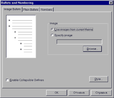 Диалоговое окно Bullets and Numbering имеет три вкладки. При помощи первой вкладки вы сможете определить вид маркера. Frontpage по умолчанию предложит вам применить маркировку, принадлежащую к той декорации, которую вы используете для данной страницы. Однако вы можете использовать и иное изображение, указав его при помощи кнопки Browse. Как вы понимаете, для того, чтобы список выглядел привлекательно, маркер должен иметь небольшие размеры.