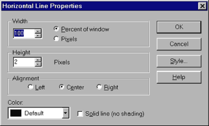 В секции Width (Длина) вы можете указать длину линии в пикселах или в процентах от ширины окна в браузере. Затем в секции Height (Высота) введите толщину линии. В секции Alignment (Выключка) вы можете позиционировать линию по левому или правому краю или по центру, устанавливая переключатель соответственно в положение Left, Bight или Center. Из раскрывающегося списка Color (Цвет) вы сможете выбрать для линии подходящий цвет. Если значение цвета задано как Default (Цвет по умолчанию), то вы также сможете указать, нужно ли для данной линии использовать затенение, установив флажок Solid Line (Сплошная линия). Если флажок установлен, то линия отображается цветом, установленным по умолчанию (обычно серым), а если линия использует затенение, то цвет по умолчанию оттенен цветом подложки страницы.
