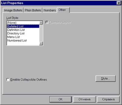 Для изменения стиля списка установите курсор в пределах списка и нажмите правую клавишу мыши. Затем выберите позицию List Properties (Свойства списка) в контекстном меню. Вы увидите диалоговое окно List Properties, очень похожее на диалоговое окно Bullets and Numbering, за исключением того, что в нем присутствует дополнительная вкладка Other (Прочее). В ней вы можете выбрать такие возможности, как маркировка списка при помощи графических изображений, список-меню, список-указатель (рис. 8). Выбрав стиль, нажмите кнопку ОК, и Frontpage сразу же применит указанный стиль к списку.