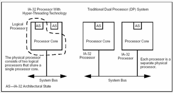 Классическому “одноядерному” процессору добавили еще один блок AS — IA-32 Architectural State. Architectural State содержит состояние регистров (общего назначения, управляющих, APIC, служебных). Фактически, AS#1 плюс единственное физическое ядро (блоки предсказания ветвлений, ALU, FPU, SIMD-блоки и пр.) представляет из себя один логический процессор (LP1), а AS#2 плюс все то же физическое ядро — второй логический процессор (LP2). У каждого LP есть свой собственный контроллер прерываний (APIC — Advanced Programmable Interrupt Controller) и набор регистров. Для корректного использования регистров двумя LP существует специальная таблица — RAT (Register Alias Table), согласно данным в которой можно установить соответствие между регистрами общего назначения физического CPU. RAT у каждого LP своя. В результате получается схема, при которой на одном и том же ядре могут свободно выполняться два независимых фрагмента кода т. е. де-факто — многопроцессорную систему!