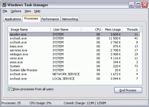 Ну и наконец последнее: в реальности пользователь имеет дело не с одним, не с двумя, и даже не с тремя процессами. На приведенном коллаже (это действительно коллаж, потому что со скриншота Task Manager были удалены все пользовательские процессы, т. е. приложения, запускаемые “для работы”) хорошо видно, что “голая” Windows XP, сама по себе, не запустив еще ни одного приложения, уже породила 12 процессов, причем многие из них к тому же еще и многопоточные, и общее количество потоков достигает двухсот восьми штук!
