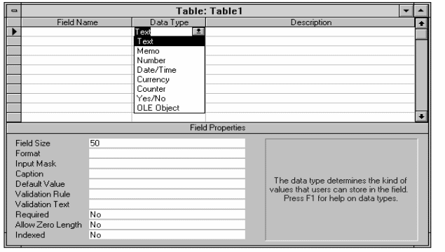 Каждому полю, включаемому в запись, приписывается тип данных, определяющий вид информации, которая будет храниться в данном поле. Тип данных вносится в колонку Data Type, причем его можно выбрать из списка доступных типов.
