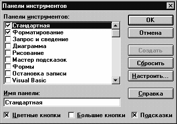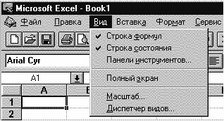 Пользователь имеет возможность изменить вид экрана табличного процессора в соответствии со своими потребностями. Можно отключить панель формул, если не предполагается редактирование и ввод новых данных. Если вы обладаете достаточным опытом работы с программой Ехсе1 и не нуждаетесь в указании текущих режимов работы табличного процессора, расшифровке команд меню, подсказке о предназначении инструментов, то можно отказаться от строки состояния. Можно отключить или выбрать другие панели инструментов. Такие изменения производятся с помощью команды Вид из меню команд.