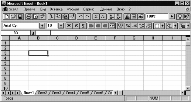 Рабочее поле табличного процессора располагается на экране дисплея. Большую часть экрана занимает окно документа, в котором размещается электронная таблица, расчерченная с помощью вертикальных и горизонтальных линий на ячейки. Таблица обрамлена рамкой, используемой для нумерации строк и наименования столбцов. Номер текущей электронной таблицы (листа) высвечивается в нижней части экрана.