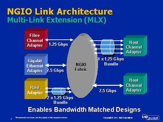NGIO предоставляет совершенно отличный подход к организации шины периферийных устройств. В основе этого подхода лежит не слотавая, а линковая организация интерфейса между устройствами ввода-вывода и адаптером каналов (Channel Adapter).