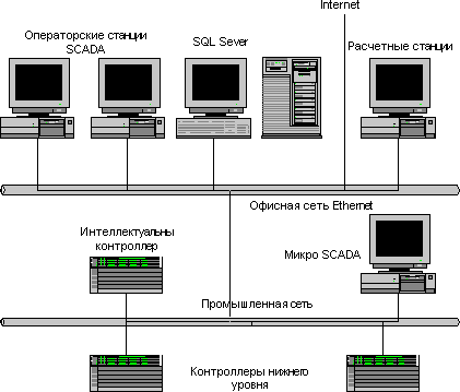 Как правило, это двухуровневые системы, так как именно на этих уровнях реализуется непосредственное управление технологическими процессами. Специфика каждой конкретной системы управления определяется используемой на каждом уровне программно - аппаратной платформой.